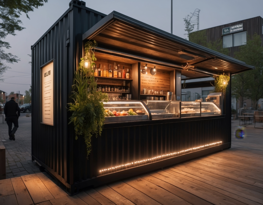 A modern pop-up food stall in a repurposed shipping container, reflecting the popular F&B concepts seen at venues like Boxpark or Last Exit in Dubai. It's an inviting scene for an evening bite as the city's pleasant outdoor season begins in late September.