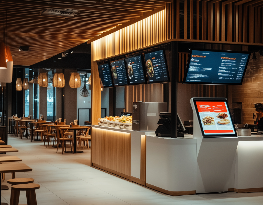 The sleek interior of a modern, fast-casual restaurant, featuring a self-service ordering kiosk and digital menu boards. The warm, wood-accented design and contemporary lighting create a welcoming atmosphere for diners.