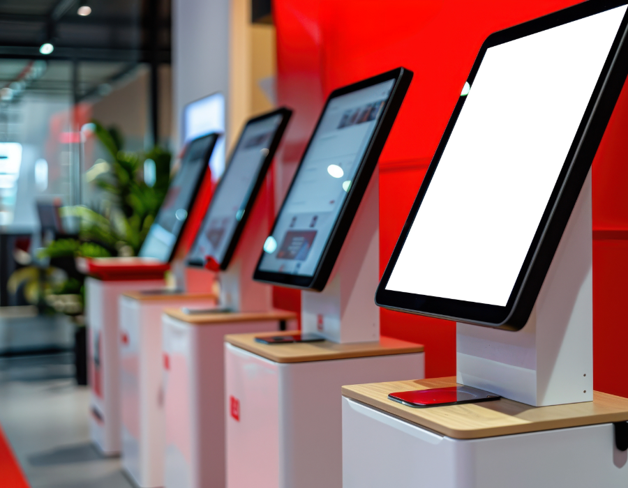 Sleek digital kiosk in a Dubai retail store or service center, embodying the city's focus on smart technology and modern customer experiences. The customizable screen is ideal for digital menus, check-ins, or information services.